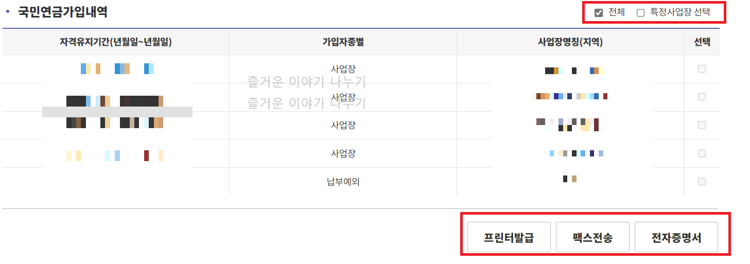 국민연금 가입증명서 신청을 완료하면 과거부터 현재까지 국민연금 가입내역이 모두 조회됩니다. 국민연금 가입증명서는 전체내역 모두 출력도 가능하며, 특정사업장만 선택하여 국민연금 가입증명서 출력도 가능합니다.