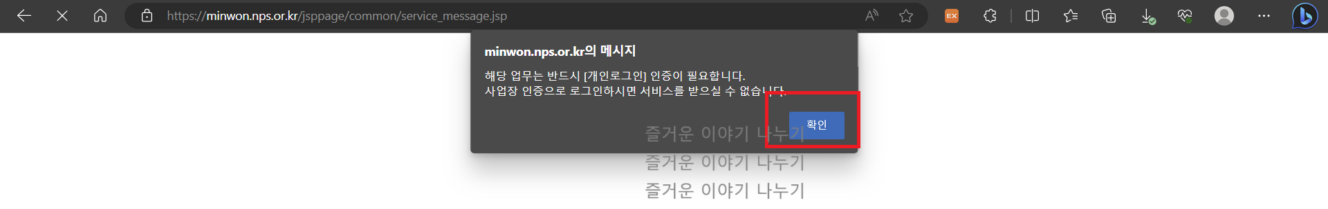 국민연금 가입증명서를 발급받기 위해 국민연금 전자민원서비스에 접속한 후 중간에 위치하고 있는 국민연금 가입증명서 발급 버튼을 누릅니다. 국민연금 가입증명서 발급을 클릭하면 "개인로그인"이 필요하다는 팝업창이 뜨고, 확인을 누르면 인증로그인 창으로 이동합니다.