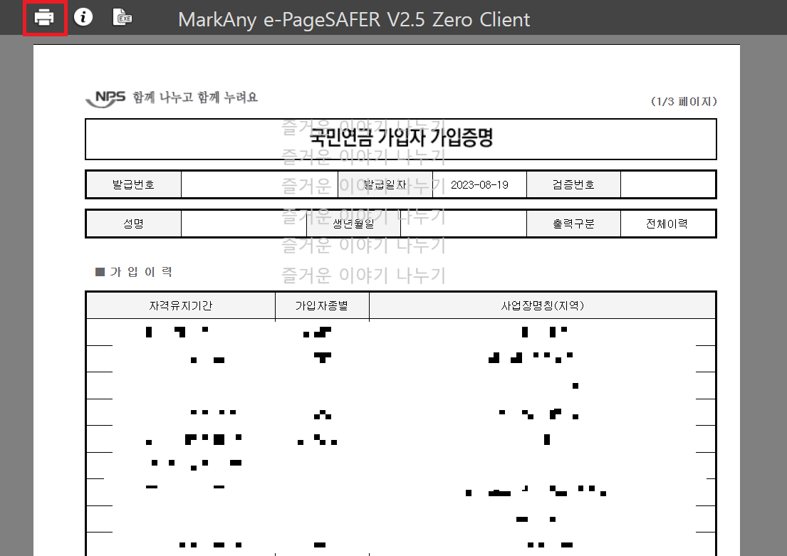 국민연금 가입증명서 발급 후 인쇄 시 미리보기로 서식 내용 확인이 가능합니다. 국민연금 가입증명서 가입이력이 제대로 체크되어 있는지 확인 후 왼쪽 상단 프린터 아이콘을 누르면 국민연금 가입증명서를 출력합니다.