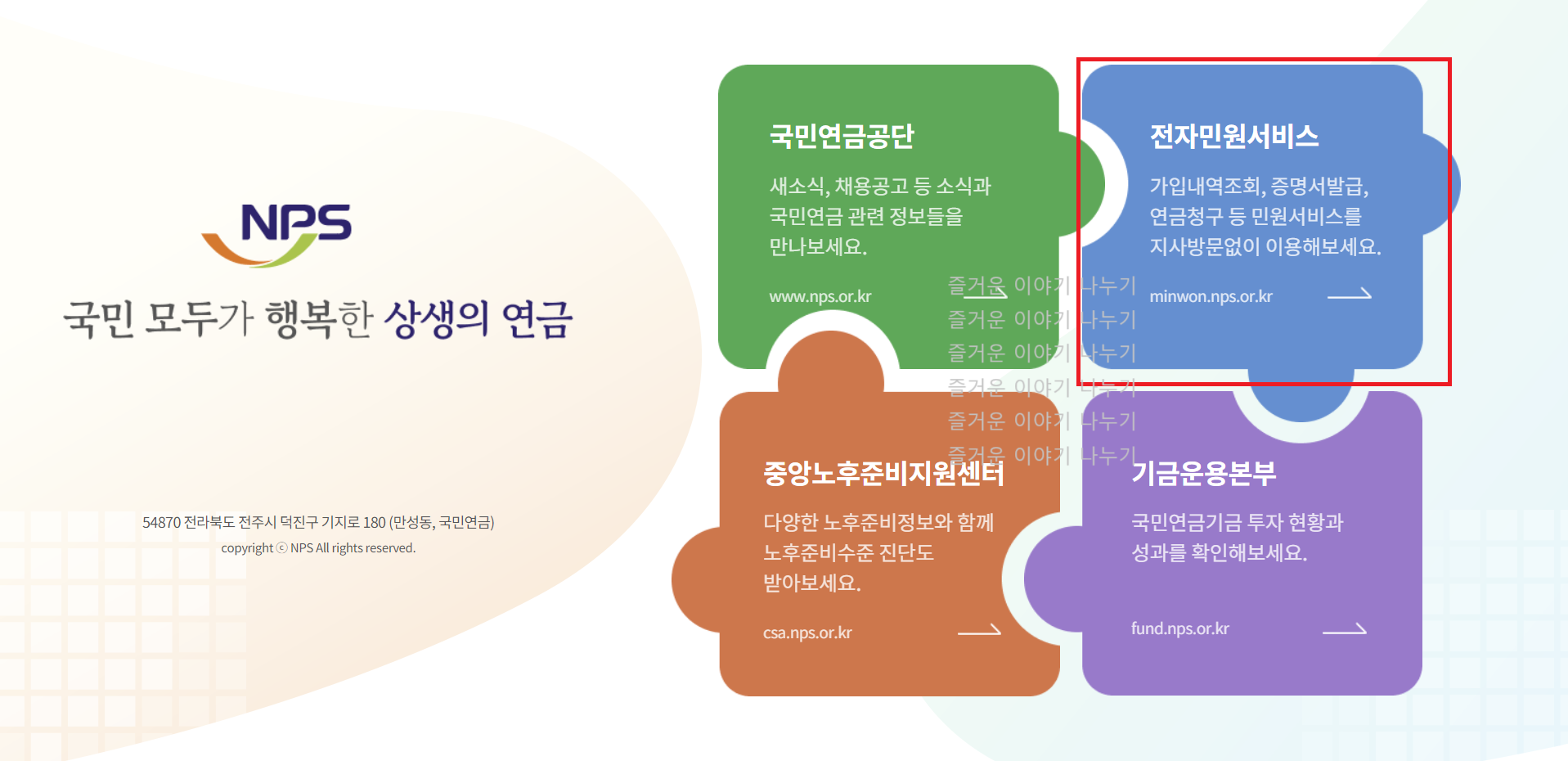 국민연금 가입증명서는 국민연금공단 홈페이지에서 발급이 가능합니다. 국민연금 가입증명서 인터넷발급 하는 경우 수수료는 발생하지 않으므로 인터넷과 프린터만 있으면 누구나 손쉽게 발급할 수 있습니다. 우선 국민연금공단 홈페이지에 접속하여 전자민원서비스를 선택합니다.