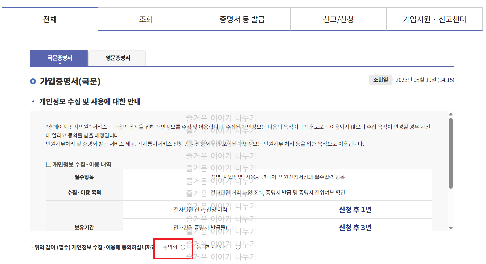 국민연금 가입증명서 발급을 위해 인증로그인을 하면, 국문증명서와 영문증명서 중 원하는 발급증명서 유형을 선택할 수 있습니다. 이후 국민연금 가입증명서 발급을 하기 위해 필수 개인정보 수집 및 이용과 선택 개인정보 수집 및 이용, 고유식별정보 수집 및 이용에 동의 후 확인 버튼을 누르면 국민연금 가입증명서 신청이 완료됩니다.